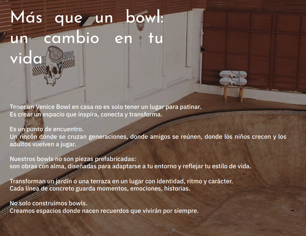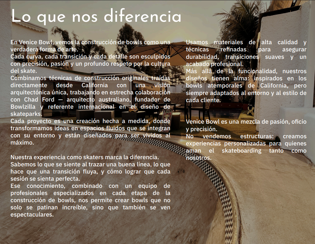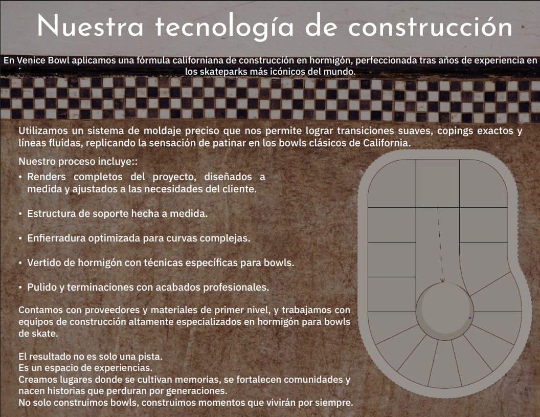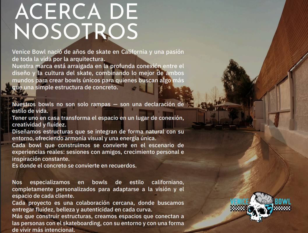Venice Bowl es una marca especializada en el diseño y construcción de skateparks y bowls de skate con estándares de calidad californiana. Fusionamos ingeniería, creatividad y cultura del skateboarding para crear espacios únicos que potencian el estilo de vida rider y elevan la experiencia de quienes los disfrutan.